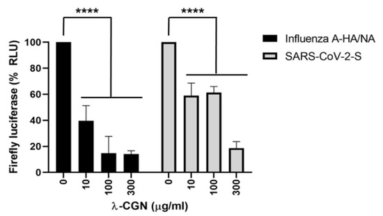 Inhibition of Influenza A and Sars-CoV-2 by lambda-carrageenan expressed as firefly luciferase. Influenza A viral proteins (black bars) over increasing concentrations of lambda-carrageenan. Sars-Cov-2 spike proteins (grey bars) over increasing concentration of lambda-carrageenan [43].