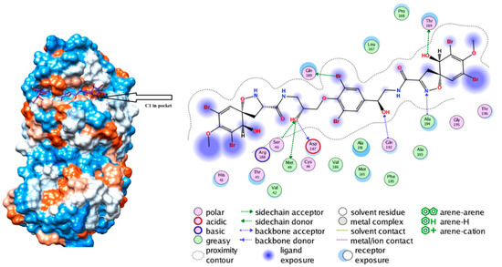 Moreover, a study done by Khan et al. performed molecular docking analysis on Mpro and found that several marine compounds demonstrated promising binding interactions [31]. Five marine compounds, isolated from sea sponges of family Aplysinidae and Petrosia stronglyophora sp. and the soft coral Pterogorgia citrina were found to interact with Mpro through hydrogen and hydrophobic interactions [31]. Analysis of ADME properties depicted them to have potential Sars-Cov-2 therapeutic application [31]. One marine compound (C1, from the family Aplysinidae) was found to fit the Mpro pocket the best, having affinity for all regions of Mpro with much higher hydrogen and hydrophobic interactions [31]. As seen in Figure 5, C1 residues Ser46, Met49, Asp186, Gln192, Ala194, Thr169 as well as Gln189 interacted with Mpro through H-bonding [31]. This finding gives insight into the spatial location that the compounds have in the binding pocket where there are also hydrophobic and electrostatic interactions present.