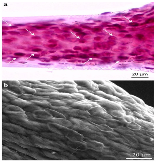 Image depicts the specialized spherulocyte cells in the chitinous skeletal fibers of verongiid sponges. (a) Light microscopy image showing the distribution of these specialized spherulocyte cells (arrows). (b) Scanning lectron microscopy represents the morphology of these cells. Reproduced with permission from Muzychka, L. et al., Marine biomimetics: Bromotyrosines loaded chitinous skeleton as source of antibacterial agents; published by Springer Nature, 2021, [47].