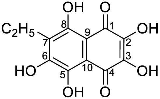 - Artyukov, A.A.; Koltsova, E.A.; Kochergina, T.Y.; Cupera, E.V.; Rutskova, T.A. Method for Producing 2,3,5,7,8-pentahydroxy-6-ethyl-1,4-naphthoquinone. Russian Patent 2283298, 10 September 2006. [Google Scholar]
