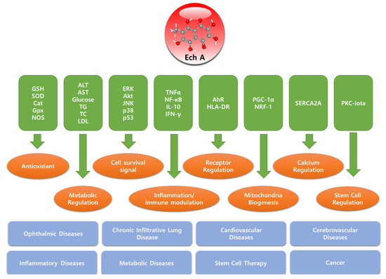 Recent studies have discovered novel mechanisms and molecular targets of the anti-inflammatory effects of Ech A [59,60,70]. Ech A effectively inhibited inflammatory bowel disease in mice with colitis. Moreover, Ech A induced the generation of T-regulatory cells and M2 macrophages (anti-inflammatory regulatory cells) through the inhibition of TNF-α, an inflammatory factor, and the activation of IL-10, an anti-inflammatory factor [60]. This M1/M2 macrophage modulation-mediated anti-inflammatory effect of Ech A was also found in bleomycin-induced scleroderma, an inflammatory skin disease, in an animal model [70]. Ech A treatment effectively inhibited scleroderma-induced skin thickness and collagen deposition and inhibited the proliferation of inflammatory M1 and M2 macrophages. TNF-α and IFN-gamma levels, which are significantly increased in scleroderma, were remarkably suppressed by Ech A [70].