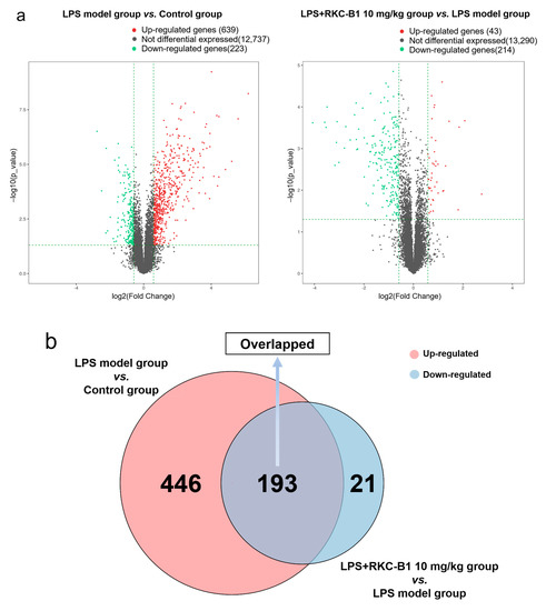 RNA sequencing analysis. (a) Volcano map analysis of DEGs in control group, LPS model group and LPS + RKC-B1 10 mg/kg group (n = 4); (b) Venn diagram of overlapped genes; (c) heat map of the overlapped genes. In this diagram, red means higher expression, and green means lower expression.