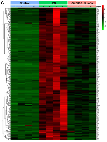 Adult male BALB/c mice with the weight of 28–22 g were purchased from SPF (Beijing, China) Biotechnology Co., Ltd. (Beijing, China; Animal certification number was SCXK (Jing) 2019–0010). All animals were kept in a pathogen-free condition with 12 h of light and dark per day at temperature of 23 ± 2 °C and humidity of 55 ± 5%. After acclimatizing for 3 days prior to experimentation, all animals were randomly divided into the following groups: control group (Control) (n = 12), which were pre-treated with an equal volume of vehicle by i.p. (normal saline with 0.1% Tween 80) for 7 days and normal saline by i.p. on the 7th day; LPS model group (LPS) (n = 12), which were pre-treated with an equal volume of vehicle by i.p. for 7 days and LPS (5 mg/kg) by i.p. on the 7th day; RKC-B1 treatment groups, which were pre-treated with RKC-B1 at doses of 5 mg/kg (LPS+ RKC-B1 5 mg/kg) (n = 8) and 10 mg/kg (LPS+ RKC-B1 10 mg/kg) (n = 12), respectively, by i.p. for 7 days and LPS (5 mg/kg) by i.p. on the 7th day [43]. After LPS injection for 6 h on the 7th day, the mice were sacrificed via decapitation and then the cortex tissues were removed and frozen at −80 °C for further research. Among the obtained cortex tissues of mice, 8 mice were used for ELISA, WB, and RT-PCR analysis, and 4 mice were used for RNA-Seq analysis. All animal care and experimental procedures regarding the animals were approved by the ethic committees of Institute of Materia Medica, Chinese Academy of Medical Sciences and Peking Union Medical College.