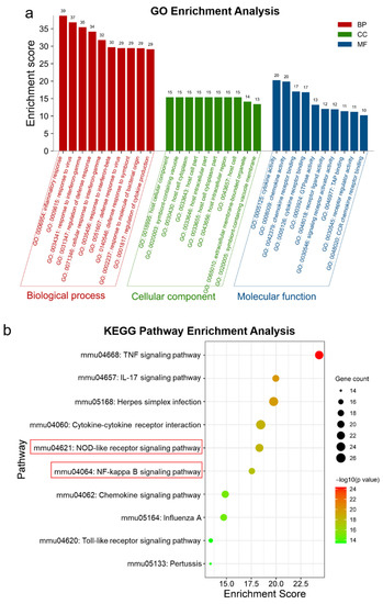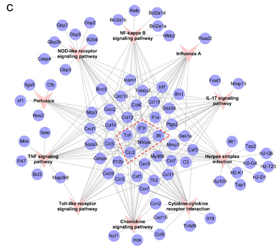 To better understand the underlying anti-neuroinflammation mechanisms of RKC-B1, the mentioned 193 core genes were then processed with GO and KEGG enrichment analysis. Top ten significant GO terms and KEGG pathways were listed in Figure 3a,b. According to GO enrichment results, the biological process (BP) of anti-neuroinflammation effect for RKC-B1 were related to inflammatory response, response to virus, response to interferon-gamma, regulation of defense response and cellular response to interferon-gamma; the cellular component (CC) of anti-neuroinflammation effect for RKC-B1 were related to host cellular component, symbiont-containing vacuole, host cell cytoplasm, host cell part and host intracellular part; and the molecular function (MF) of anti-neuroinflammation effect for RKC-B1 included cytokine activity, chemokine activity, chemokine receptor binding, cytokine receptor binding and GTPase activity. Besides, the significant signaling pathways of KEGG enrichment analysis indicated that anti-neuroinflammation of RKC-B1 mainly included TNF signaling pathway, IL-17 signaling pathway, cytokine–cytokine receptor interaction, NF-κB signaling pathway, NOD-like receptor signaling pathway, chemokine signaling pathway and Toll-like receptor signaling pathway. Then, the targets-pathway network of RKC-B1 against neuroinflammation was constructed in Figure 3c. After analyzing the network, Tnf, Il1b, Nfkbia, Il6, Ccl2, Ccl12 and Ccl5 with higher degree value of 9, 9, 8, 8, 7, 7 and 7, respectively, among all the genes in the network might play a crucial role for RKC-B1 against neuroinflammation.