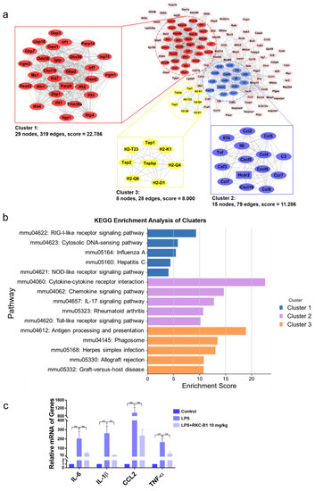 We further established the PPI network of the 193 core genes for RKC-B1 against neuroinflammation. After MCODE clustering analysis, the top 3 main PPI modules of PPI network were displayed as Figure 4a. Cluster 1 contained 29 nodes, 319 edges, a score of 22.786, and the seed gene (highest scoring node in the cluster) was Parp9; cluster 2 contained 15 nodes, 79 edges, a score of 11.286, and the seed gene was Hcar2; cluster 3 contained 8 nodes, 28 edges, a score of 8.000, and the seed gene was Tapbp. Then, we performed KEGG enrichment analysis to found the related pathways of these 3 clusters, respectively. Top five KEGG enrichment pathways of different clusters were listed as Figure 4b. In cluster 1, RIG-I-like receptor signaling pathway, cytosolic DNA-sensing pathway and NOD-like receptor signaling pathway belonged to “organismal systems, immune system” class, while influenza A and hepatitis C belonged to “human diseases, infectious disease: viral” class. In cluster 2, chemokine signaling pathway, IL-17 signaling pathway and Toll-like receptor signaling pathway belonged to “organismal systems, immune system” class, while rheumatoid arthritis belonged to “human diseases, immune disease” class. In cluster 3, antigen processing and presentation belonged to “organismal systems, immune system” class; herpes simplex infection belonged to “human diseases, infectious disease: viral” class; and allograft rejection and graft-versus-host disease belonged to “human diseases, immune disease” class. Therefore, the KEGG pathways of each cluster verified that the mechanisms for RKC-B1 against neuroinflammation were closely related to immune system and immune disease. Then, we conducted RT-PCR analysis of IL-6, IL-1β, CCL2 and TNF-α included in cluster 2 that were also ranked the top in the degree value in Figure 3c and associated with neuroinflammation as well-known pro-inflammatory factors. The RT-PCR results in Figure 4c were consistent with the RNA-Seq analysis.