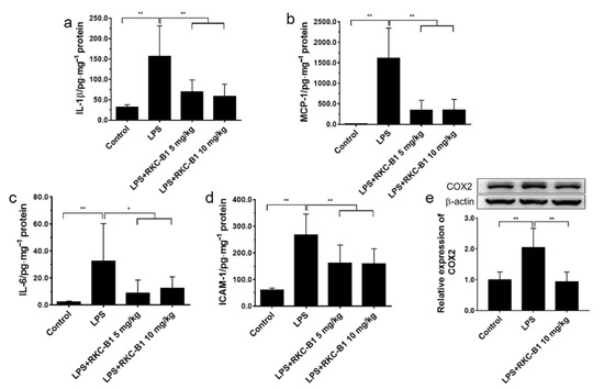 Effect of RKC-B1 on inflammatory factors in cortex tissue of LPS-stimulated mice. The levels of IL-1β (a), MCP-1 (b), IL-6 (c) and ICAM-1 (d) were assessed by ELISA (n = 7 or 8/group). The expression level of COX2 (e) were assessed by Western blot (n = 5/group). Data are expressed as the mean ± SD. Statistical significance is assessed by one-way ANOVA analysis to compare the results between different groups * p < 0.05, ** p < 0.01 vs. LPS model group.