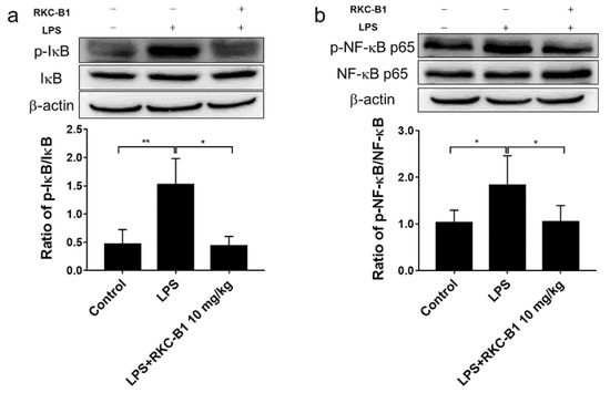Effect of RKC-B1 on phosphorylation of IκB and NF-κB p65. (a) Ratio of p-IκB to IκB; (b) Ratio of p-NF-κB p65 to NF-κB p65; data are expressed as the mean ± SD (n = 5/group). Statistical significance is assessed by one-way ANOVA analysis to compare the results between different groups * p < 0.05, ** p < 0.01 vs. LPS model group.