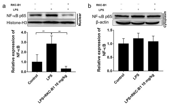 Besides the phosphorylation of IκB and NF-κB p65 in NF-κB signaling pathways, we further investigated the NF-κB nuclear translocation in the present study. The results showed that the level of NF-κB p65 was significantly increased in the nucleus, but almost unchanged in cytoplasm after LPS injection in the cortex of mice. However, RKC-B1 treatment at 10 mg/kg notably suppressed NF-κB nuclear translocation (Figure 7a,b).