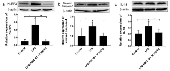 Effect of RKC-B1 on NLRP3/cleaved caspase-1 signaling pathway. (a) Protein expression levels of NLRP3; (b) protein expression levels of cleaved caspase-1; (c) protein expression levels of IL-18. Data are expressed as the mean ± SD (n = 5/group). Statistical significance is assessed by one-way ANOVA analysis to compare the results between different groups * p < 0.05, ** p < 0.01 vs. LPS model group.
