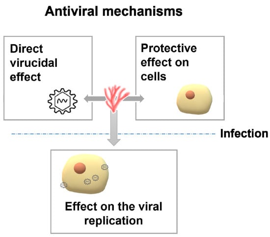 Sulfated polysaccharides mimicking the heparan sulfate are potential antivirals that can interfere with the early stages of viral replication, including the virus entry, by masking the positive charge of the virus surface receptors to prevent them from binding to the heparan sulfate proteoglycans in the host cell surface [2,8,9,10,11]. Although highly sulfated synthetic glycomimetics are effective inhibitors of viral infection both in vitro and in vivo [12], natural polysaccharides from renewable sources offer advantages in relation to their low cost, absence of toxicity and side effects, wide spectrum of activity, and low induction of resistance [13,14]. Recent research on the strong antiviral activity of polysaccharides, particularly against enveloped viruses, can be found [9,10,14].