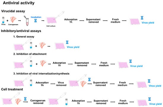 Seaweed polysaccharides present many advantages as antiviral drugs, such as the relatively low production costs and wide availability, and they are safe, non-toxic, and show good biocompatibility. Carrageenans are sulfated galactans from red algae with the potential to develop anti-viral drugs and can be proposed alone or in combination with existing drugs, a field deserving further study [29]. Carrageenans could be used for the development of novel broad-spectrum antivirals, with minimum resistance and with other interesting activities, such as anti-inflammatory, antioxidant, and immunomodulatory activities, as an alternative to the toxicity and cost of therapeutic agents [13,16]. The major challenges to their development have been described in relation to: