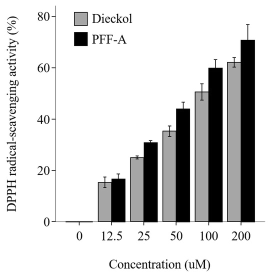 Antioxidant effect of dieckol and phlorofucofuroeckol A (PFF-A), measured as 1,1-diphenyl-2-picrylhydrazyl (DPPH) radical-scavenging activity. Bars represent the mean ± SD.
