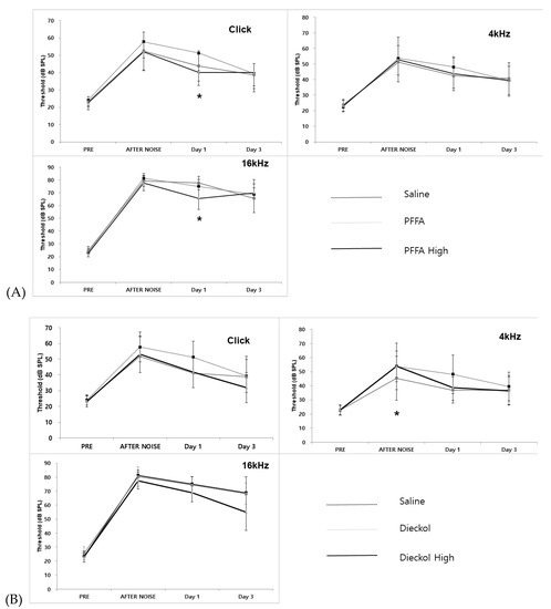 Hearing changes after noise exposure in phlorofucofuroeckol A (PFF-A) and dieckol treatment. Hearing was measured at 4 h and 1 and 3 days after noise exposure at click and 4 and 16 kHz. (A) PFFA and High PFF-A treatment; the high-PFF-A group had a significantly lower threshold shift than the Saline + Noise group at click stimuli (p = 0.015) and 16 kHz (p = 0.018) 1 day after noise exposure. (B) Dieckol and High-Dieckol treatment. The Dieckol group showed less threshold shift than the Saline + Noise group at immediately after noise exposure at 4 kHz (p = 0.042) (* p < 0.05).