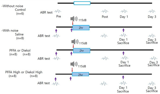 A total of 46 mice were randomly assigned to the following groups: Saline (n = 6), Saline + Noise (n = 8), PFF-A (10 mg/kg) + Noise (n = 8), High PFF-A (100 mg/kg) + Noise (n = 8), Dieckol (10 mg/kg) + Noise (n = 8), and High- dieckol (100 mg/kg) + Noise (n = 8) (Figure 5). Mice were administered dieckol and PFF-A via intraperitoneal injection. The mice were treated on 3 consecutive days starting 1 day before the noise exposure. The mice were exposed to 115 dB SPL of noise one single time for 2 h.