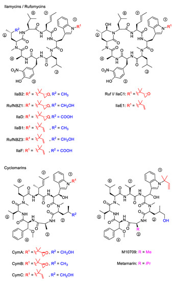 The structures of ilamycins/rufomycins (Figure 1) are unusual, as these cyclic heptapeptides contain a series of atypical amino acids. Most prominent is the N-prenylated tryptophan ①, which can also be found in the epoxidized form [24,25]. At the N-terminus of the tryptophan, a γ,δ-unsaturated amino acid is incorporated ⑦ [26]. Common to all derivatives is a unique 3-nitrotyrosine ③, a building block not found in any other natural product. The greatest variability is observed in the leucine building block ⑤, which can be oxidized to different oxidation levels at a terminal methyl group. In its original description, ilamycin was proposed to contain an aldehyde functionality [23], but structural elucidation by NMR and X-ray crystallography showed that the aldehyde functionality undergoes cyclization with the nearby amide bond [27,28,29]. Very recently, a wide range of new ilamycins/rufomycins were described, differing mainly in the combination of different amino acid oxidation levels ⑤ and the N-prenyl substituent of ① (alkene, epoxide, diol) [27,28,29].