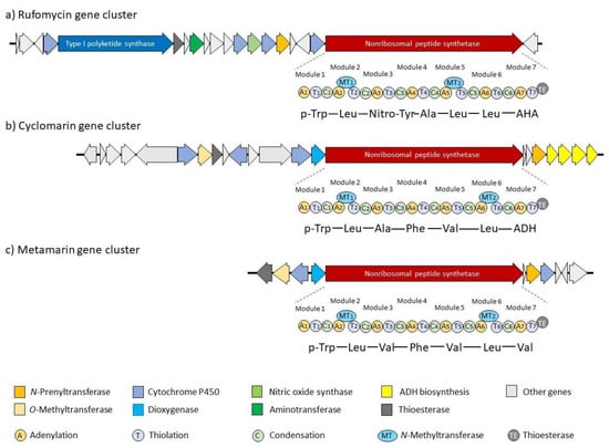 Biosynthesis of rufomycins and (modified) cyclomarins; (a) Rufomycin gene cluster, (b) Cyclomarin gene cluster, (c) Metamarin gene cluster.