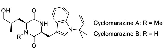 Although the cyclomarins are structurally related to the ilamycins, they are significantly different, at least from a biosynthetic point of view (Figure 2b) [34,35]. In contrast to the ilamycins, the linear unsaturated amino acid AHA is replaced by the dimethylated derivative ADH, which has a completely different biosynthetic origin. While AHA is obtained by a classical polyketide synthase, ADH is formed from valine and pyruvate [35]. Of the 23 ORFs of the biosynthetic gene cluster, several genes are responsible for ADH synthesis. Another significant difference is the β-OH functionality of the prenylated tryptophan (p-Trp), which is found in all cyclomarins but not in the ilamycins and rufomycins. Its introduction is catalyzed by a tryptophan-β-hydroxylase, a dioxygenase, and occurs on the protein-bound peptide in the early stages of the biosynthesis. In contrast, epoxidation of the N-prenyl side chain by a P450 epoxidase occurs post-NRPS assembly. Gene inactivation of the prenyltransferase eliminated the production of cyclomarin, indicating that p-Trp is the initiator of the peptide assembly line and that the unmodified p-Trp is not a good substrate for the first acceptor domain [34]. The β-hydroxylation must occur during the first two steps of the peptide synthesis, since inactivation of the corresponding gene does not result in the formation of a desoxycyclomarin but the formation of a dioxopiperazine called cyclomarazine (Figure 3), containing only the first two amino acids of the biosynthesis.