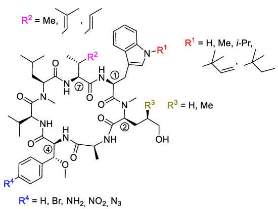 In 1999, the research groups of Fenical and Clardy reported the isolation of three new anti-inflammatory cyclic peptides from extracts of a Streptomyces sp. collected in Mission Bay, California [30]. These secondary metabolites from the strain CNB-982, called cyclomarins (Cym) A−C, are structurally related to the rufomycins. Very similar amino acid building blocks are incorporated, although in a different sequence. As in the rufomycins, an N-prenylated tryptophan ①(CymC) is a notable building block that can also be epoxidized (CymA). However, in contrast to the rufomycins, in the cyclomarin series, the tryptophan units are β-hydroxylated. At the N-terminus of the tryptophan, a γ,δ-unsaturated amino acid is incorporated, not a linear one as found in the rufomycins, but one that is branched and dimethylated ⑦. One of the leucines is also oxidized at the δ position ②, at least in CymA and C, but at another position, as in the rufomycins. Most obvious is the replacement of the unique nitrotyrosine by another aromatic amino acid, syn-β-methoxyphenylalanine ④.