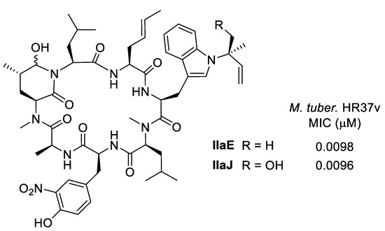 - Higashidani, E.; Ueyanagi, J.; Shibata, M.; Nakazawa, K.; Miyake, A.; Iwasaki, H.; Yamamoto, H. Studies on Streptomycetes. 2. Rufomycin A and A, new antituberculous antibiotics. Agric. Biol. Chem. 1962, 26, 234–237. [Google Scholar]