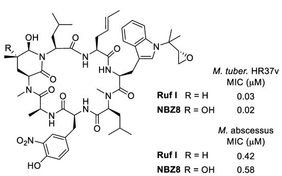 In addition, at this time Shibata et al. isolated two new antibiotics, rufomycin I and II (Ruf I and Ruf II), from the newly discovered Streptomyces atratus (46408), found to be especially active against acid-fast bacteria [16,17]. The compounds were also active against Mycobacterium tuberculosis and Mycobacterium smegmatis but almost inactive against most other bacteria, fungi, and yeasts. Subsequent research indicated that these two antibiotics possess very similar chemical structures [18,19,20,21,22,23].