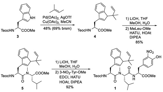 The synthesis of peptide fragment 1 was rather straightforward (Scheme 2). 2-(Trimethylsilyl)ethoxycarbonyl (Teoc)-protected tryptophan methylester 3 was subjected to a Pd-catalyzed N-tert-prenylation according to a protocol developed by Baran et al. [39]. Saponification of the ester moiety of 4 and peptide coupling with N-methylated Leu-OMe produced dipeptide 5, which was further elongated to tripeptide 1.