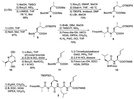 For the larger fragment 2, glutamic acid was converted into protected 8 (Scheme 3) according to a synthetic route developed during the synthesis of dysithiazolamide [40]. The glutamic acid was converted into the dimethyl ester and N-Boc protected before it was stereoselectively α-methylated at the sterically least-hindered ester moiety [41,42]. For the chemoselective reduction of the γ-ester 6, a second N-Boc-protecting group was introduced, and the sterically least-hindered ester functionality was reduced with DIBAL-H. Silyl protection of the primary alcohol and subsequent mono-Boc deprotection yielded 7. The methyl ester was saponified (to avoid α-methylation), and the Boc-amide was selectively N-methylated to 8 with NaH/MeI. The free carboxylic acid 8 was converted into the corresponding benzyl ester. TMSOTf/NEt3 was used for selective cleavage of the N-Boc-protecting group without affecting the OTBDPS group. The free amine could be coupled with Fmoc-protected alanine, and the C-terminal benzyl ester was cleaved by catalytic hydrogenation to provide the free acid 9.