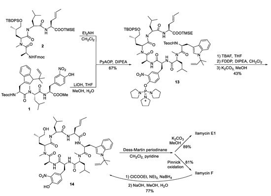 With the two major building blocks produced, ilamycin synthesis could proceed to the final step (Scheme 4). Mild saponification of the methylester 1 and coupling with Fmoc-deprotected 2 using (2-azabenzotriazol-1-yloxy)tripyrrolidinophosphonium hexafluorophosphate (PyAOP) [44] yielded 13 without significant epimerization. Global deprotection with TBAF resulted in the linear heptapeptide, which was subjected to macrolactamization. While many peptide coupling reagents have been investigated, the best results were obtained using pentafluorophenyl diphenylphosphinate (FDPP) [45]. As a side product in addition to the expected cyclopeptide 14, the diphenylphosphinylated ester was formed, which could directly be converted into 14 by treatment with K2CO3 in methanol, providing an overall yield of 43% of the desired 14. Finally, only the primary OH-functionality needed to be oxidized. Depending on the oxidation protocol, both ilamycin E1 and F could be obtained. Ilamycin E1 was obtained as a single stereoisomer. Notably, ilamycin F is also available on a gram scale via fermentation, but the derivative E1, which is approximately 100-fold more potent, is not. Therefore, the authors developed a protocol to convert ilamycin F into intermediate 14 by reducing the mixed anhydride, permitting an interconversion of ilamycin F into ilamycin E1 [38].
