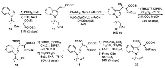 The first synthesis of cyclomarin C was reported in 2004 by Yao and coworkers [47]. The unusual tert-prenylated β-hydroxy-tryptophan ① was obtained from indole derivative 15 (Scheme 5). This compound is available from indole via N-alkylation with ethyl-α-bromo-propionate, subsequent α-methylation of the ester, LAH-reduction, and acetylation [48]. Formylation and a subsequent Horner–Wadsworth–Emmons reaction yielded α,β-unsaturated ester 16, which could be subjected to a Sharpless aminohydroxylation [49]. Moderate yield and enantioselectivity of the desired β-hydroxytryptophan derivative 17 was obtained. Unfortunately, no comment was made concerning the regioselectivity of the reaction. Silylation of the β-hydroxy group and selective transesterification of the acetate gave rise to primary alcohol 18, which could be oxidized to the aldehyde and methenylated via Wittig reaction. Finally, the Cbz-protecting group from 19 was removed selectively without affecting the generated double bond. Furthermore, the free amine was Fmoc-protected after saponification of the ester. The use of the Fmoc- or Alloc-protecting group is essential for the synthesis of cyclomarins because other protecting groups, such as Boc, cannot be removed later on without side reactions, such as the elimination of the β-hydroxy functionality [50].