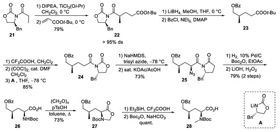 The synthesis of δ-hydroxyleucine building block ②, with the opposite configuration of the γ-methyl group than in amino acid ⑤ in the ilamycins, was obtained by classical asymmetric synthesis using chiral auxiliary chemistry (Scheme 6). According to Evans et al. [51], chiral oxazolidinone 21 was subjected as its titanium enolate in a Michael addition to tert-butyl acrylate to provide a good yield of 22 with high stereoselectivity. The imide was selectively reduced in the presence of the tert-butyl ester using LiBH4, and the resulting primary alcohol was O-benzoylated to 23. Acidic cleavage of the tert-butyl ester, activation of the carboxylic acid, and reapplication of the Evans auxiliary A provided oxazolidinone 24. Deprotonation of 24 and stereoselective azidation produced azide 25. Catalytic hydrogenation in the presence of Boc2O resulted in the formation of the N-Boc-protected amino derivative, which was saponified to the corresponding amino acid 26. The desired N-methyl group was introduced by conversion of 26 into the corresponding oxazolidinone 27, which was reduced using triethylsilane in presence of trifluoroacetic acid. Subsequent cleavage of the Boc-protecting group required its reintroduction to 28.