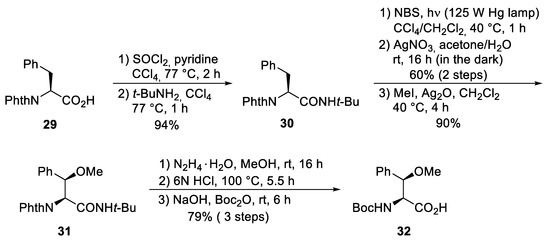 The unusual β-methoxyphenylalanine ④ was obtained from N-phthaloyl-protected phenylalanine 29, which was converted into the corresponding tert-butylamide 30 (Scheme 7). Oxygen functionality was introduced into the β-position by subjecting 30 to a Wohl–Ziegler bromination, providing a 1:1 diastereomeric mixture of the desired β-bromo derivative [52]. According to Easton et al., treatment of the diastereomeric mixture with AgNO3 in aqueous acetone produced the desired (2S,3R)-β-hydroxyphenylalanine enantio- and diastereoselectively [53]. The stereochemical outcome can be explained by a preferred conformation of the benzylic carbenium ion in the substitution step. The best selectivities were obtained with the tert-butylamide. Subsequent O-methylation provided the methoxy derivative 31, converted into the N-Boc-protected amino acid 32 under standard conditions.