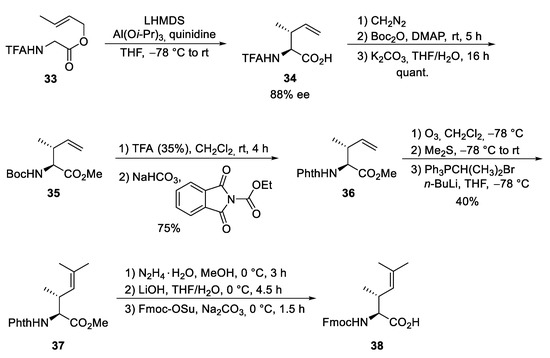 Finally, the unsaturated amino acid ⑦ was obtained via an asymmetric chelate enolate Claisen rearrangement, developed by Kazmaier et al. (Scheme 8) [54,55]. Trifluoroacetyl (TFA)-protected glycine crotyl ester 33 was deprotonated and converted into a chelated aluminum ester enolate, which in the presence of quinidine underwent a [3,3]-sigmatropic rearrangement to unsaturated amino acid 34 with good yield and enantioselectivity. Epimerization of the α-stereogenic center was avoided by first converting 34 into the Boc-protected ester 35 and then, in a second step, into the corresponding phthaloyl-protected derivative 36. A direct epimerization-free conversion (34 to 36) was not possible. Ozonolysis of the double bond and subsequent Wittig reaction produced protected amino acid 37, finally converted into the Fmoc-protected acid 38.