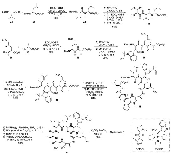 The synthesis of the tetrapeptide started with the coupling of protected δ-hydroxyleucine 28 with alanine allyl ester 45. After N-deprotection, the Fmoc-protected tryptophan 20 was coupled using Bop-Cl/DIPEA [57]. Careful removal of the Fmoc-protecting group from 47 and EDC/HOBT-coupling with the unsaturated building block 38 provided tetrapeptide 40. Finally, the C-terminal allyl ester was cleaved under mild Pd-catalyzed conditions, and the two peptide fragments were ready for the fragment coupling. An excellent yield of 48 was obtained using EDC/HOAt, which proved more suitable than HOBT. Subsequent deprotection of the C- and the N-terminus and removal of the OTBS-protecting group from the hydroxytryptophan provided the linear peptide precursor, which could be cyclized to 49 using PyBOP [58] under high dilution conditions and providing good yields. Finally, the benzoyl group had to be removed from the hydroxyleucine and cyclomarin C was purified via preparative HPLC.