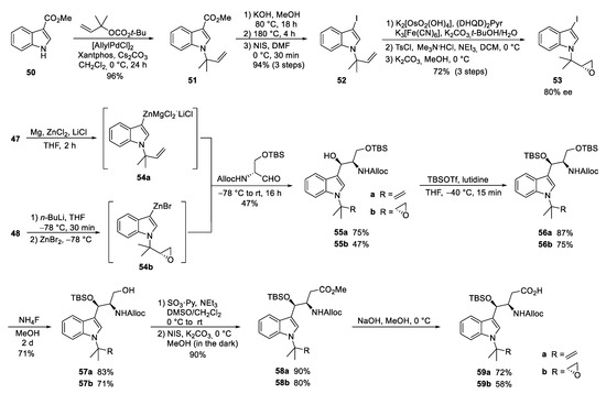 The second synthesis of cyclomarin C and the first for cyclomarin A were reported in 2016 by Barbie and Kazmaier [59]. Both natural products differ only in the oxidation state of the prenylated β-hydroxytryptophan unit ①, which is epoxidized in cyclomarin A. Therefore, a synthetic protocol was developed which gave access to both tryptophan derivatives (Scheme 11). The synthesis started with a relatively new method for regioselective tert-prenylation of electron-demanding indoles [60]. Using indole ester 50, a palladium-catalyzed protocol delivered the required product 51 in almost quantitative yield. At 0 °C, no competitive n-prenylation was observed. In the next step, the activating ester functionality needed to be replaced by iodine. Saponification of the ester and heating the neat acid to 180 °C resulted in a clean decarboxylation to the N-prenylated indole, which could be iodinated in almost quantitative yield. Iodide 52 was used as a key building block for the synthesis of cyclomarin C, and after epoxidation, cyclomarin A. According to Yokohama et al. [61], 52 was subjected to a Sharpless dihydroxylation, which unfortunately demonstrated only moderate stereoselectivity. The best results were obtained with (DHQD)2Pyr as chiral ligand, but the ee did not exceed 80 % [62]. Subsequent tosylation of the primary OH-group and treatment with a base provided a good yield of the desired epoxide 53. The iodides 52 and 53 were next converted into organometallic reagents and reacted with a protected serinal. While the corresponding Grignard reagents provided only moderate yields and selectivities, zinc reagents were found to be superior. According to Knochel et al. [63,64], 52 was presumably converted into the indole–zinc–magnesium complex 54a, which was reacted with freshly prepared protected serinal to give the desired syn-configured 55a as a single diastereomer. In the case of the epoxyindole 53, a slightly different protocol was used. To avoid side reactions during the metalation step, 53 was lithiated at −78 °C with n-BuLi and transmetallated with ZnBr2 [63,64]. The zinc reagent 54b was directly reacted with the aldehyde to create 55b. According to NMR and HPLC, only two diastereomers (ratio 9:1) could be detected following the Sharpless dihydroxylation step. Obviously, the carbonyl addition also here was highly stereoselective. Next, the secondary OH-functionality was TBS-protected under the assumption that a primary OTBS-group could be removed selectively [65]. Notably, only a combination of TBSOTf and lutidine gave the desired product 56a in high yield, while all other methods failed and resulted in the decomposition of 55a. Interestingly, no complete conversion was obtained for 55b, but the silyl ether 56b was obtained as a single stereoisomer. Obviously, the undesirable diastereomer did not undergo silylation. Next, the primary silyl protecting group was removed using NH4F in MeOH [66]. The free alcohols 57 had to be oxidized to the desired carboxylic acids 59, which were found to be highly sensitive and not very stable. By far, the best results were obtained using a two-step protocol beginning with a Parikh–Doering oxidation [67]. The also very labile aldehydes were directly oxidized to the corresponding methyl esters 58 with N-iodosuccinimide in MeOH [68]. These are stable, can be stored under standard refrigeration, and should be saponified to the free acids 59 on demand.