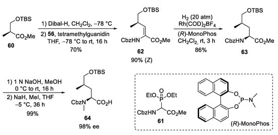 A straightforward protocol was developed for the protected δ-hydroxyleucine ②, starting with the commercially available (S)-Roche ester, which was O-silylated to 60 (Scheme 12). Subsequent Dibal-H reduction provided the corresponding aldehyde, which was subjected to a Horner–Wadsworth–Emmons reaction using Schmidt’s phosphonoglycinate 61 [69]. The unsaturated amino acid 62 obtained was subjected to asymmetric hydrogenation [70] using (R)-MonoPhos as a chiral ligand [71,72]. Subsequent saponification of 63 and N-methylation yielded the desired building block 64.