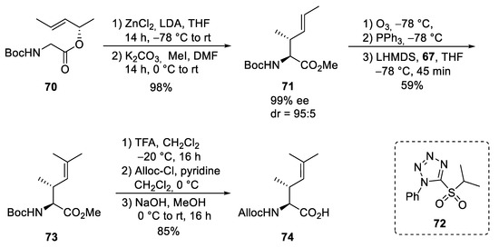 For the synthesis of the fourth, the unsaturated amino acid ⑦, also a chelate enolate Claisen rearrangement, was used starting with chiral ester 70 (Scheme 14) [74,75,76]. Rearrangement of the corresponding zinc enolate proceeded with complete chirality transfer and high stereoselectivity, and ester 71 was obtained after O-methylation. Ozonolysis provided the desired aldehyde, which was subjected to a Wittig reaction. However, only tiny amounts of the desired product could be obtained, even with a large excess of the Wittig reagents, which also caused the chiral aldehyde’s epimerization. Better results were obtained with a modified Julia–Kocienski reagent 72, normally used for (E)-selective olefination [77]. Under these conditions, the desired unsaturated building block 73 could be obtained almost epimerization-free. Saponification and change in the N-protecting group provided amino acid 74.