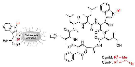 In studies of cyclomarin biosynthesis, Moore et al. identified an N-prenyltransferase to prenylate tryptophan prior to loading the modified amino acid onto the NRPS [35]. A knockout mutant of Salinospora arenicola CNS-205 with a disrupted prenyltransferase gene failed to produce cyclomarins but did produce desprenylcyclomarin C, although at a 100-fold lower production rate. Obviously, tryptophan is not a good substrate for the cyclomarin NRPS, but other N-alkylated tryptophans are well accepted [34]. These can be obtained by simple alkylation of suitably protected tryptophan derivatives [81]. Feeding the bacteria with methylated and propargylated tryptophan resulted in the production of new cyclomarin derivatives CymM and CymP (Scheme 16).