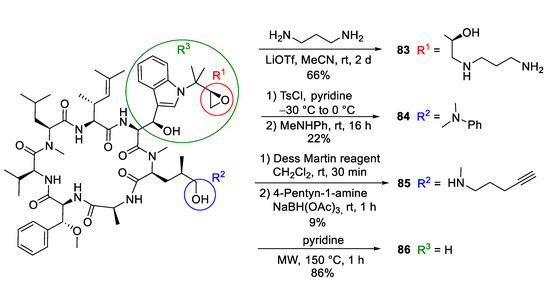 Researchers at Novartis observed that cyclomarin A might be a good candidate for drug development since it kills not only Mycobacterium tuberculosis (Mtb) but also the malaria parasite Plasmodium falciparum [82]. Thus, cyclomarin A is a rare example of a natural product with two distinct and specific modes of action. The researchers modified cyclomarin A, obtained by fermentation (Scheme 17) [83]. Ring-opening of the prenylepoxide with 1,3-propanediamine provided amine 83, which was linked to sepharose beads and processed by affinity chromatography to identify the target. Interestingly, 83 inhibits the growth of Mtb similarly to cyclomarin A [83,84]. Obviously, the epoxide of the N-prenyl side chain is not responsible for the biological activity, at least against Mtb. In contrast, replacing the terminal OH-group of the δ-hydroxyleucine ② by an N-methylanilin (84) caused a significant drop (>200 fold) in activity [83].
