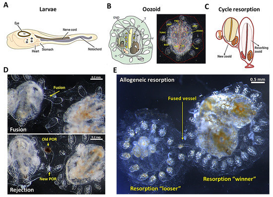 The anatomy of B. schlosseri and its different levels of naturally occurring immune responses. (A) Diagram of the tunicate larvae tadpole phase showing the nerve cord and the notochord. (B) Diagram and live imaging of the ventral view of a zooid (Z) and primary bud (BUD), embedded within a tunic (TUN) and connected with vasculature (V), which terminates in ampullae (AMP). The zooid has a branchial sac conformed by the endostyle (END), stigmata (S), cell islands (CI), digestive system (DS), and heart (H). (C) Diagram showing the “takeover” phase in the weekly cycle of zooid regeneration mediated by noninflammatory programmed cell removal of the resorbing old zooid. (D) Live imaging of two B. schlosseri colonies undergoing fusion (arrows show fused vasculature (top)) and rejection (arrows show points of rejection (POR) (bottom)). (E) Live imaging from the allogeneic resorption process, where one colony is the “loser” (which is resorbed), while the other is the “winner”, demonstrating normal developmental stages. (A,C) were created using BioRender; (B,D) were reproduced with permission from [17], Springer Nature Limited, Berlin, Germany, 2018; (E) was reproduced with permission from [16], National Academy of Sciences, 2016.
