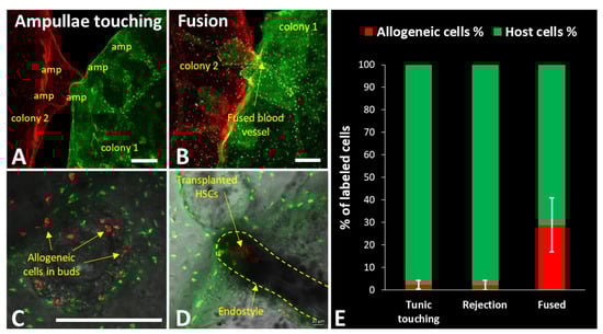 Transplantation in vivo using exogenous labeling in B. schlosseri. (A) Two colonies differentially labeled with CFSE (green) and CellTracker Deep Red, prior to fusion. (B) Fused colonies through the blood vessel and exchanged allogeneic cells can be seen in the confocal image of the live colonies. The transparent body of B. schlosseri is used to follow transplantation in vivo. (C) Transplanted allogeneic cells in a developing secondary bud, followed in a live colony. (D) Transplanted HSCs (exogenous lipophilic dye DiD, red) in the endostyle stem-cell niche in live animals. Bars = 200 µm. (E) Measurement by flow cytometry of transplanted allogeneic cell abundance 3 weeks after transplantation; average and SD of three pairs of touching animals without response, rejecting animals, and fused colonies. This shows the ability of measurement of transplantation success or modulation. (A,B,D) were reproduced with permission from [17], Springer Nature Limited, 2018; (C) was reproduced with permission from [16], National Academy of Sciences, 2016.