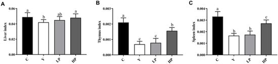 The effect of oyster peptides (OP) on the immune organ index. (A) Liver index (B) Thymus Index (C) Spleen index. Data are presented as the mean ± SD (n = 6). Bars with different letters are significantly different (p < 0.05). C: the control group; Y: the cyclophosphamide(Cy)-treated group; LP: Cy + 200 mg/kg OP; HP: Cy + 400 mg/kg OP.