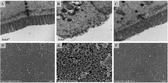 Effects of OP on the epithelial ultrastructure in mice. (TEM, 20 K×, (A): the control group; (B): the Cy-treated group; (C): Cy + 400 mg/kg OP); Effects of OP on the villi of ileum in mice (SEM, 35 K×, (D):the control group; (E): the Cy-treated group; (F): Cy + 400 mg/kg OP).