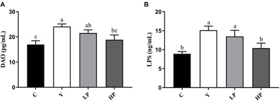 Effects of OP on the contents of (A) DAO and (B) LPS in serum of mice. Data are presented as the mean ± SD (n = 3). Different letters indicate significant (p < 0.05) differences. C: the control group; Y: the Cy-treated group; LP: Cy + 200 mg/kg OP; HP: Cy + 400 mg/kg OP.