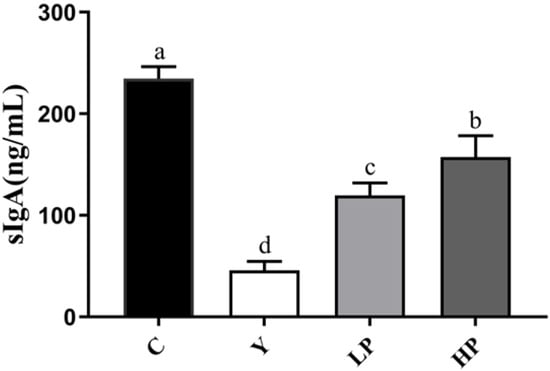 Effects of OP on the contents of sIgA in the ileum of mice. Data are presented as the mean ± SD (n = 3). Different letters indicate significant (p < 0.05) differences. C: the control group; Y: the Cy-treated group; LP: Cy + 200 mg/kg OP; HP: Cy + 400 mg/kg OP.