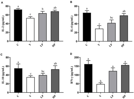 Effects of OP on the contents of (A) IL-2, (B) IL-4, (C) IL-10 and (D) IFN-γ in the ileum of mice. Data are presented as the mean ± SD (n = 3). Different letters indicate significant (p < 0.05) differences. C: the control group; Y: the Cy-treated group; LP: Cy + 200 mg/kg OP; HP: Cy + 400 mg/kg OP.