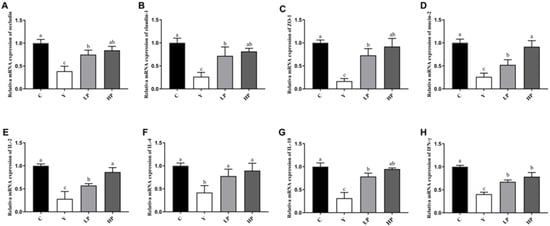The effects of OP on the relative gene levels of intestinal tight junction and inflammatory cytokines were determined by RT-PCR. As shown in Figure 6A–D, the relative mRNA expressions of Occludin, Claudin-1 and ZO-1 in the Y group were substantially decreased (p < 0.05), suggesting that Cy destroyed the tight junctions between epithelial cells. However, after administration of OP, the mRNA levels of Occludin, Claudin-1 and ZO-1 were significantly enhanced (p < 0.05), in a dose-dependent manner. Compared with the C group, the mRNA level of mucin-2 in the Y group was significantly decreased (p < 0.05), and this situation was significantly improved in LP and HP groups. Mucin-2 is a kind of glycoprotein secreted by epithelial cells, which plays a role in cell protection and lubrication in tissue epithelium []. The results indicated that OP has a protective effect on the intestinal tract.