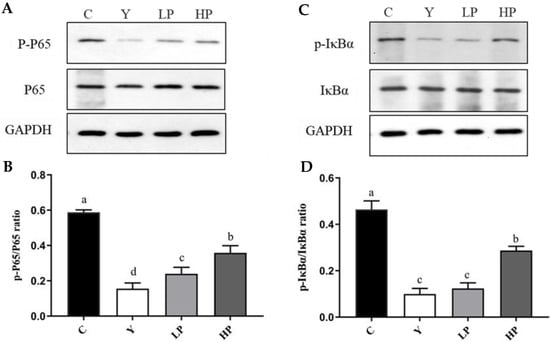 Effects of OP on the NF-κB pathway in the ileum of Cy-treated mice. (A) The protein expression levels of p-p65 and p65. (B) The ratio of p-p65/p65. (C) The protein expression levels of p-IκBα and IκBα. (D) The ratio of p-IκBα/IκBα. GAPDH was utilized as an internal control. Data are presented as the mean ± SD (n = 3). Different letters indicate significant (p < 0.05) differences. C: the control group; Y: the Cy-treated group; LP: Cy + 200 mg/kg OP; HP: Cy + 400 mg/kg OP.