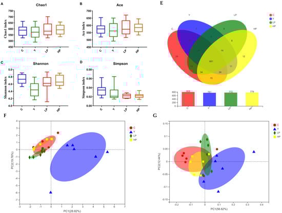 Effects of OP on the gut microbiota in the Cy-induced Immunosuppressed mice (n = 6 per group). (A) Chao1 index, (B) Ace index, (C) Shannon index, (D) Simpson index, (E) Venn diagram, (F) Principal components analysis (PCA), (G) Principal co-ordinates analysis (PCoA). C: the control group; Y: the Cy-treated group; LP: Cy + 200 mg/kg OP; HP: Cy + 400 mg/kg OP.