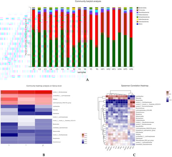 Effects of OP on community structure of intestinal microflora in immunosuppressed mice (n = 6 per group). (A) The community structures of gut microbiota at phylum levels. (B) The community structures of gut microbiota at genus levels. (C) Spearman’s correlations heatmap between bacterial taxa and host immune parameters. C: the control group; Y: the Cy-treated group; HP: Cy + 400 mg/kg OP. Different colors of squares represent different r values of Spearman’s correlation. (* p < 0.05; ** p < 0.01; *** p < 0.001).