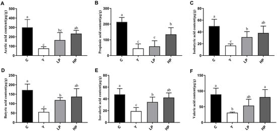 Effects of OP on the short-chain fatty acid content in immunosuppressed mice. (A) Acetic acid, (B) Propionic acid, (C) Isobutyric acid, (D) Butyric acid, (E) Isovaleric acid, (F) Valeric acid. All data are presented as the mean ± SD (n = 6). Different letters indicate significant (p < 0.05) differences. C: the control group; Y: the Cy-treated group; LP: Cy + 200 mg/kg OP; HP: Cy + 400 mg/kg OP.