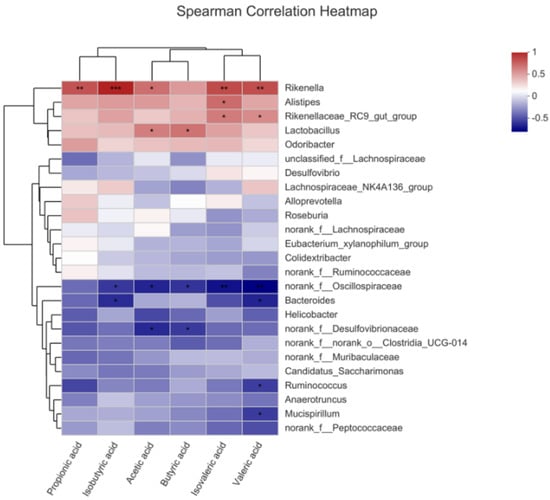 Spearman’s correlations heatmap between bacterial taxa and short-chain fatty acids (n = 6 per group). Different colors of squares represent different r values of Spearman’s correlation. (* p < 0.05; ** p < 0.01; *** p < 0.001).